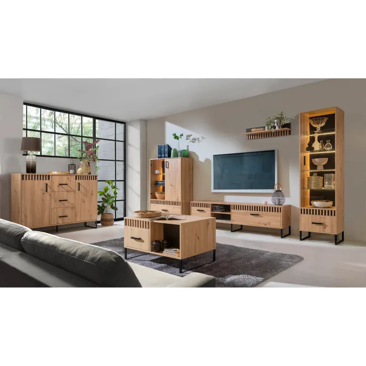 Odśwież wystrój swojego domu dzięki nowoczesnej i eleganckiej wysokiej witrynie MELLE 3. Ten wspaniały mebel dodaje ciepła i stylu do Twojego salonu czy jadalni, biorąc inspirację z najnowszych trendów w designie. Niezależnie od tego, czy użyjesz go jako barku, miejsca do wyeksponowania ulubionych ozdób czy przechowania książek, z pewnością zwróci on na siebie uwagę gości.