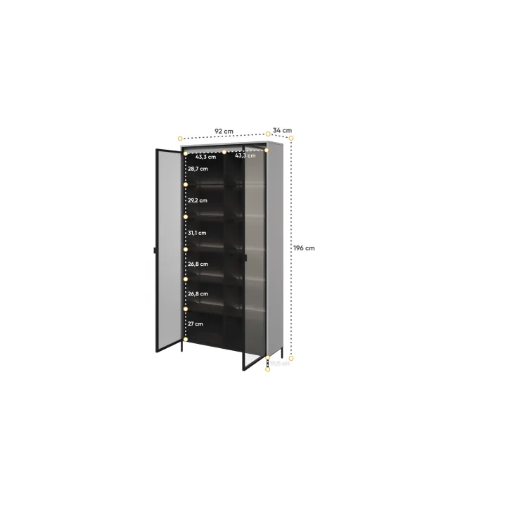 Wysoka witryna "TREVIOLO" to wyjątkowy mebel, który wniesie niepowtarzalny styl do każdego pomieszczenia. Wyróżnia się swoją nowoczesnością i elegancją, jednocześnie zapewniając mnóstwo praktycznego miejsca do przechowywania. Witryna "TREVIOLO" to doskonałe połączenie funkcjonalności i wyrafinowanego designu.