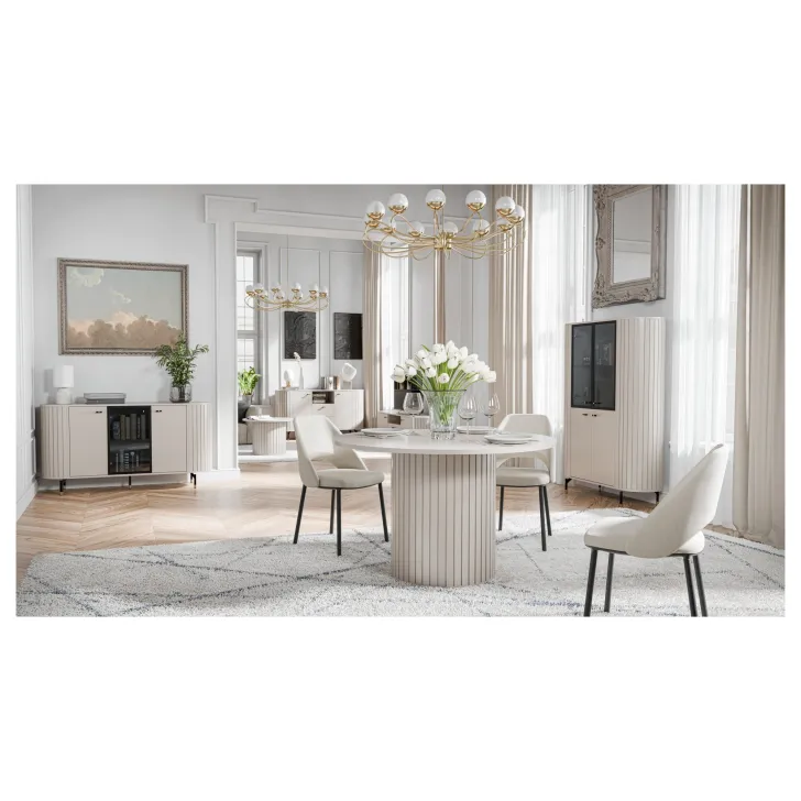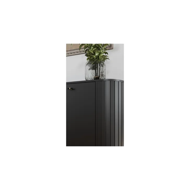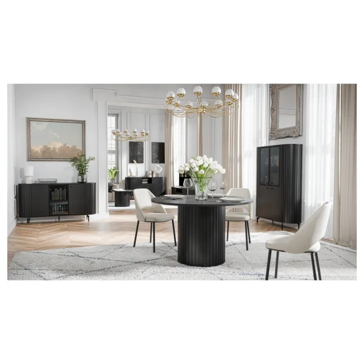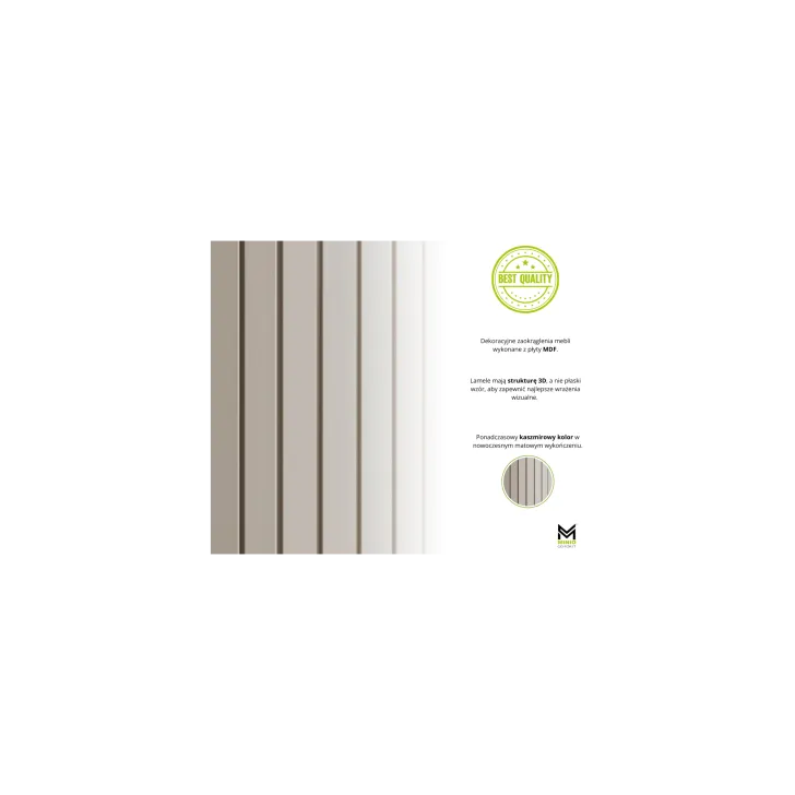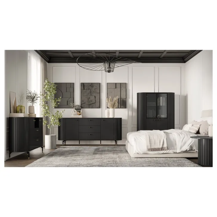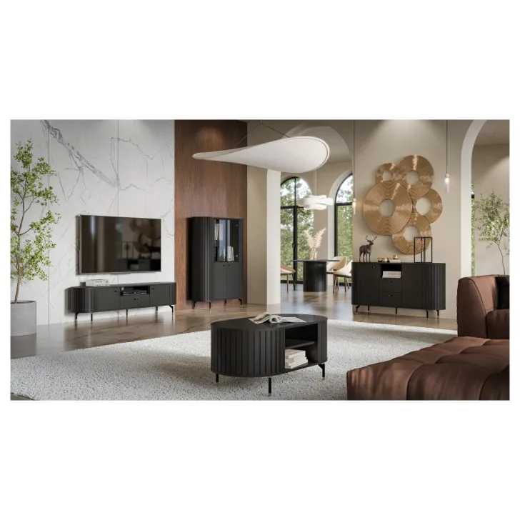 Zwraca uwagę wysokiej jakości wykonanie - zaokrąglone boki z MDF oraz korpus i tył z płyty laminowanej o grubości 16 mm to gwarancja trwałości i niezwykłej estetyki. Projekty serii ZAMA 1 charakteryzują się nowoczesnym designem oraz subtelnymi nóżkami i uchwytami w tonacji czarno-złotej, które dodają meblom nie tylko lekkości, ale również ekskluzywnego wyglądu.