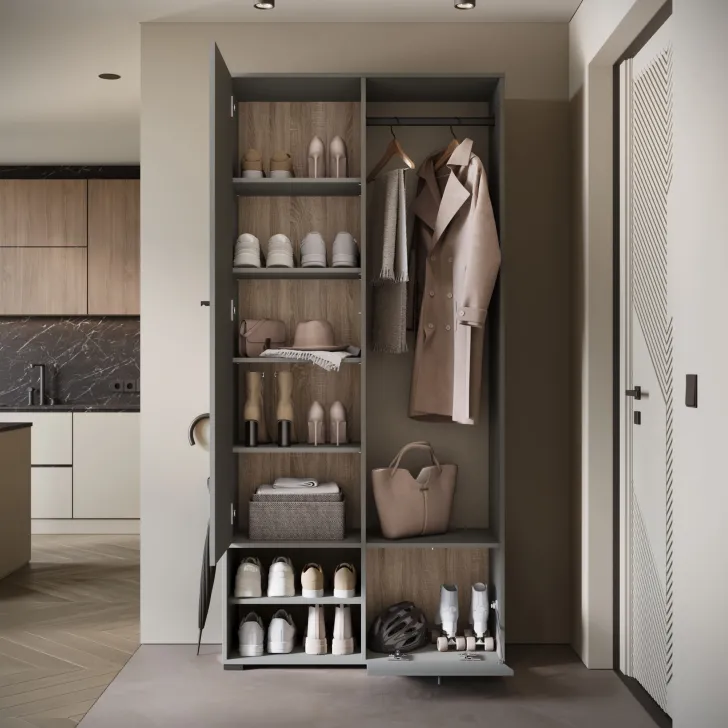 - Otwarte wnęki i praktyczna szafka na buty
