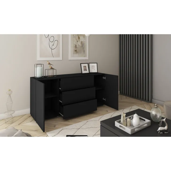 W ofercie dostępne są cztery warianty kolorystyczne: czarny, biały/biały połysk, dąb wotan/czarny oraz biały/biały połysk/dąb wotan. Wybierz ten, który najlepiej pasuje do Twojego wnętrza i ciesz się elegancją, jaka niesie ze sobą komoda z kolekcji BRELA.