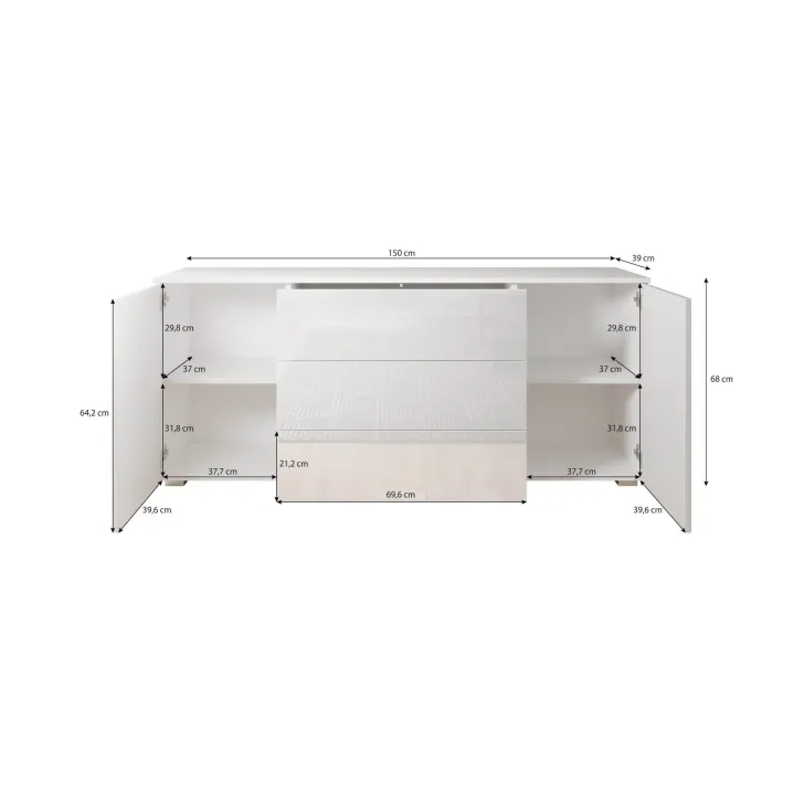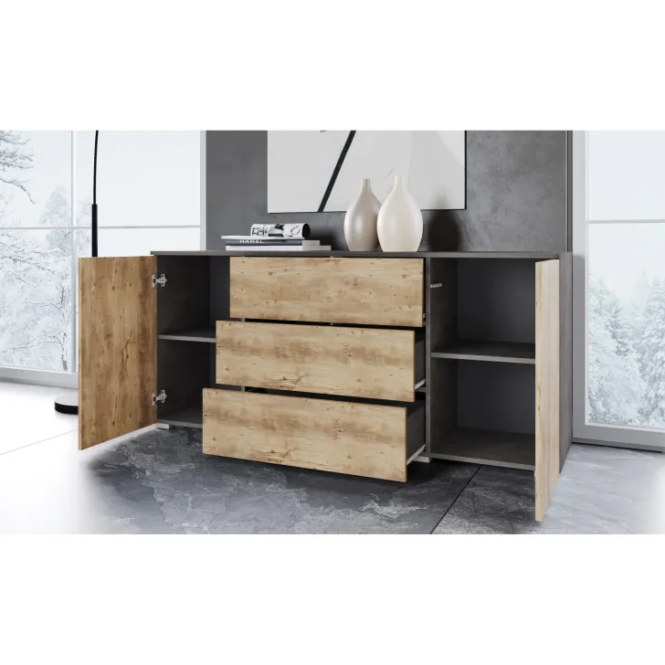 Komoda posiada dwie otwierane szafki z półkami po obu stronach i trzy pojemne szuflady w środkowej części. Dzięki nim z łatwością przechowasz wszystkie niezbędne rzeczy, niezależnie od tego, czy są to ubrania, akcesoria czy inne drobiazgi.