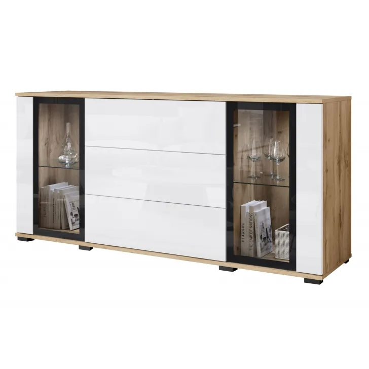Połączenie szuflad z przeszklonymi szafkami sprawia, że ten mebel jest praktyczny i stylowy. Dzięki uniwersalnemu wyglądowi, komoda FARO 150 z łatwością dopasuje się do różnych aranżacji wnętrz, dodając klasycznym i nowoczesnym przestrzeniom dodatkowego uroku.