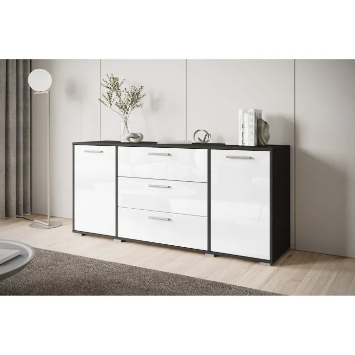 Komoda dostępna jest w kolorach Dąb wotan/czarne krawędzie, Dąb wotan/biały połysk, Biały/biały połysk, Matera/biały połysk.