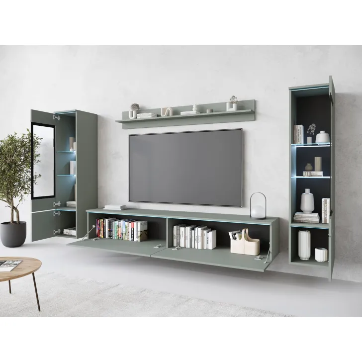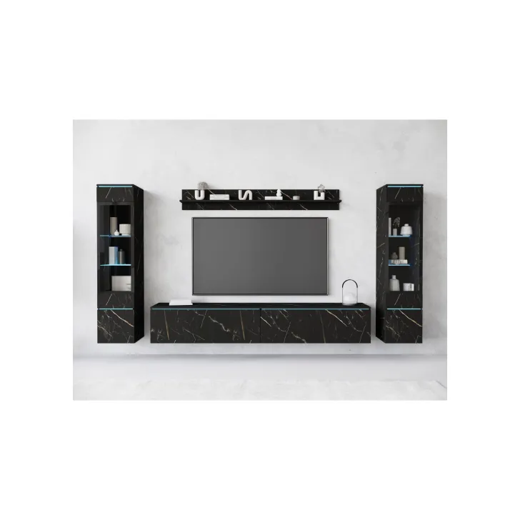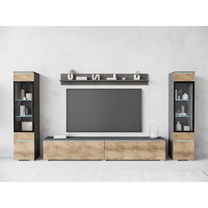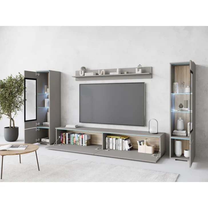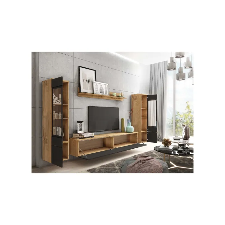 Alegoria elegancji w postaci szafki RTV, półki i dwóch witryn, zapewni, że twoje wnętrza będą wyglądały modnie i funkcjonalnie. Meblościanka "VEVE 2" będzie doskonałym wyborem, zarówno do nowoczesnych, jak i tradycyjnych wnętrz. Każdy element tej meblościanki może być wiszący lub stojący, co daje nieograniczone możliwości organizacji przestrzeni.