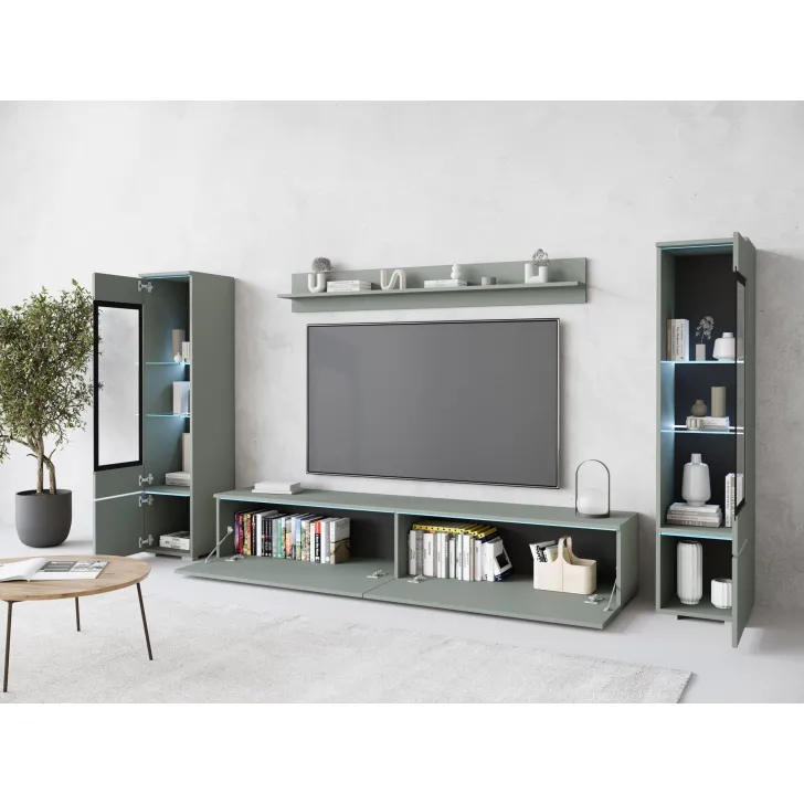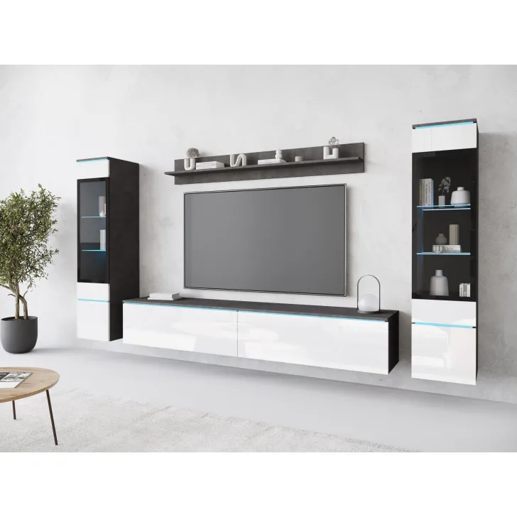 Dodatkowo, Meblościanka "VEVE 2" dostępna jest w wielu różnych wykończeniach, takich jak: Dąb wotan/czarny połysk, San Sebastian, Czarny, Dąb Artisan, Grafit Matera/biały połysk, Dąb wotan/biały połysk, Biały, Dąb wotan, Beton/biały połysk, Misty green, Szary pallad, grafit Matera/kasztan wrocławski, Kaszmir, Biały matowy/szary połysk - na pewno znajdziesz kolor, który idealnie dopasuje się do Twojego salonu.
