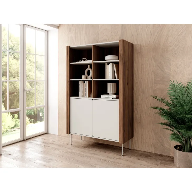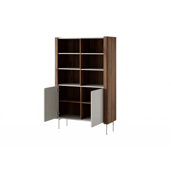 Optymalizując przestrzeń we wnętrzu, Regał VEZERE pozwala Ci nie tylko przechowywać różne przedmioty, ale również stworzyć ciekawe aranżacje. Ten elegancki mebel jest wynikiem połączenia harmonijnego koloru kaszmiru z ciepłym odcieniem orzech warmia, zapewniając wyjątkowy efekt wizualny i przytulną atmosferę. Wykończenia bocznych krawędzi i zaokrąglone narożniki na frontach i bokach tworzą efektowne połączenie z minimalistyczną stylistyką.