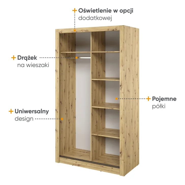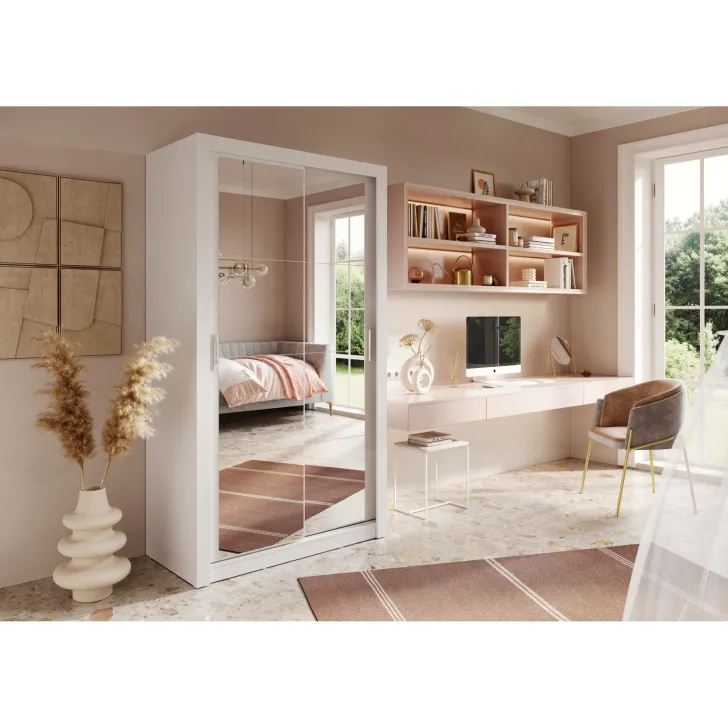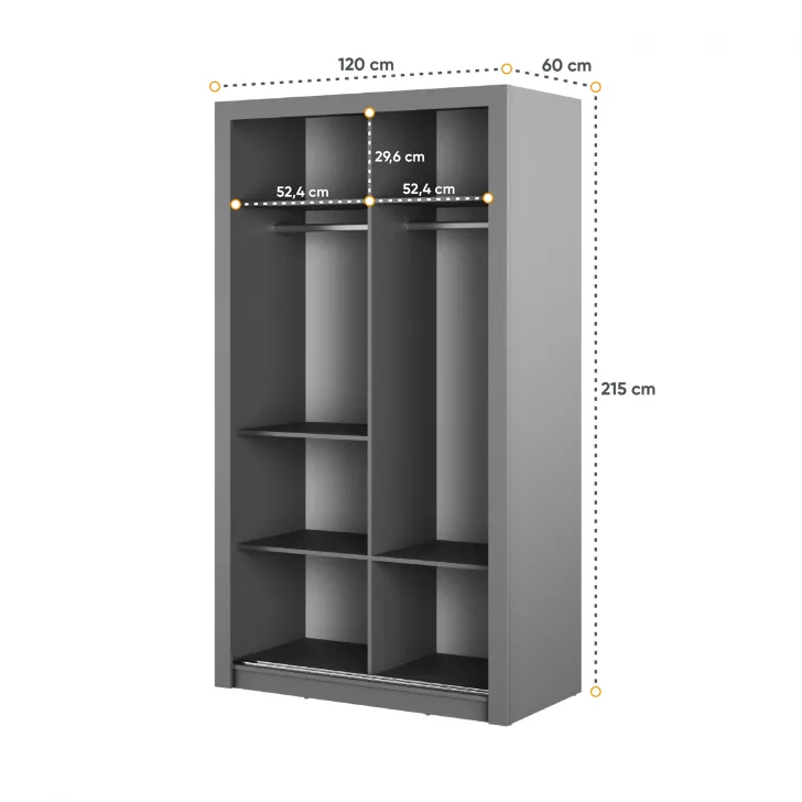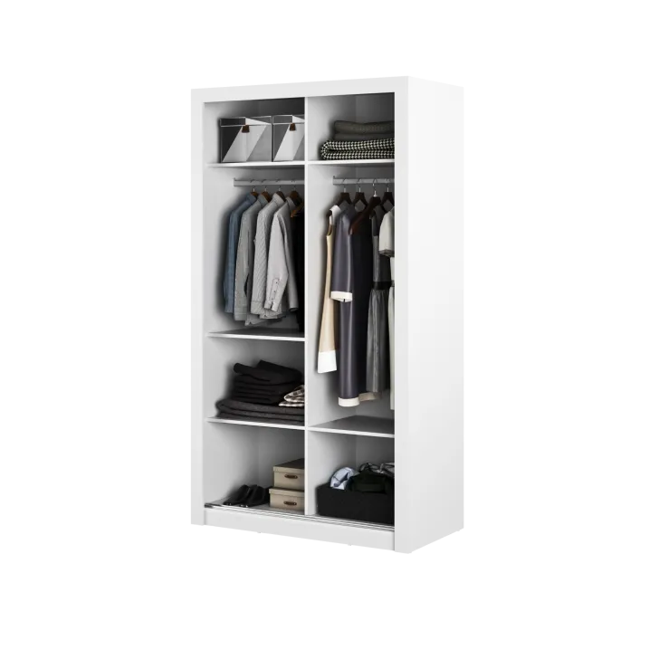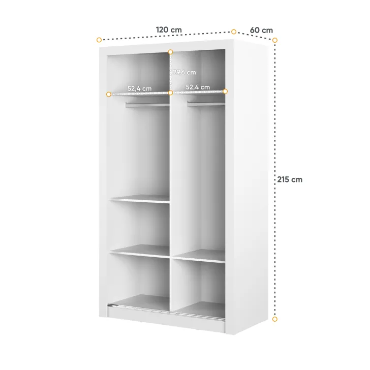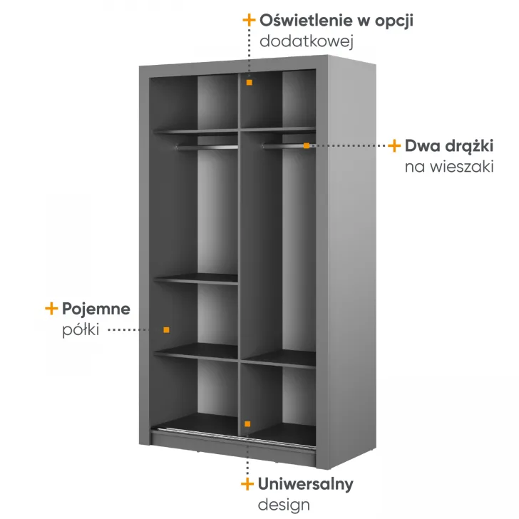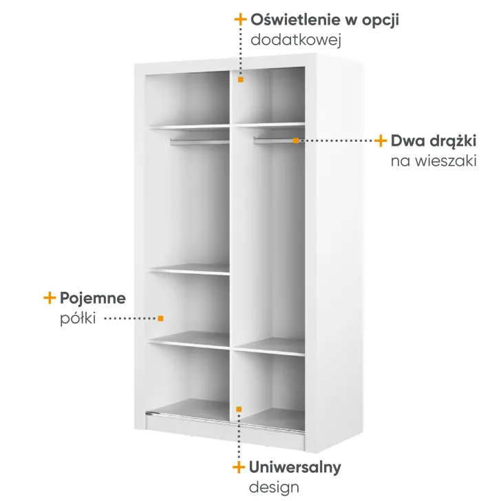 Wyposażona w dwie przesuwane drzwi z dołączonymi lustrami, szafa nie tylko dodaje przestrzeni naszemu pomieszczeniu, ale pozwala też na swobodne przejrzenie się w nich. Wewnątrz znajdziemy jeden drążek na ubrania i kilka pojemnych półek, co z pewnością ułatwi przechowywanie rzeczy. Śliskie drzwi przesuwne umożliwiają łatwy dostęp do przechowywanych w szafie ubrań. Szafa może zostać bezpiecznie przymocowana do ściany za pomocą otworów montażowych znajdujących się na tylnej i bocznych ściance szafy.