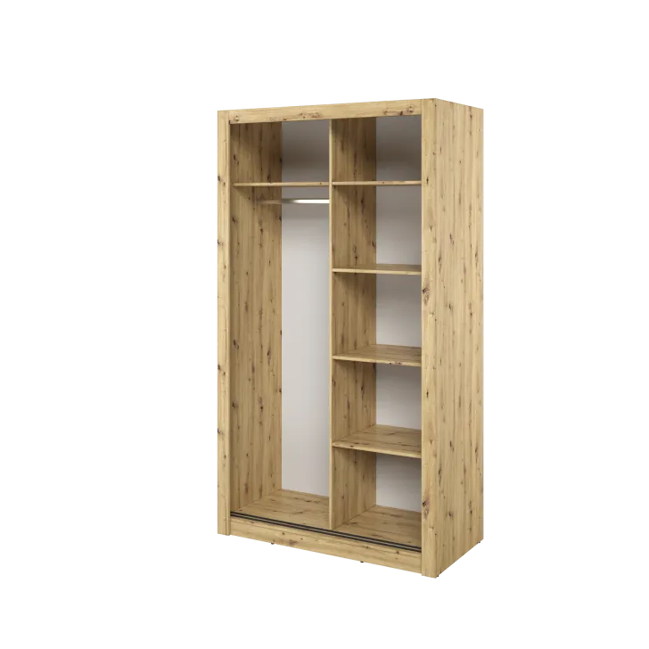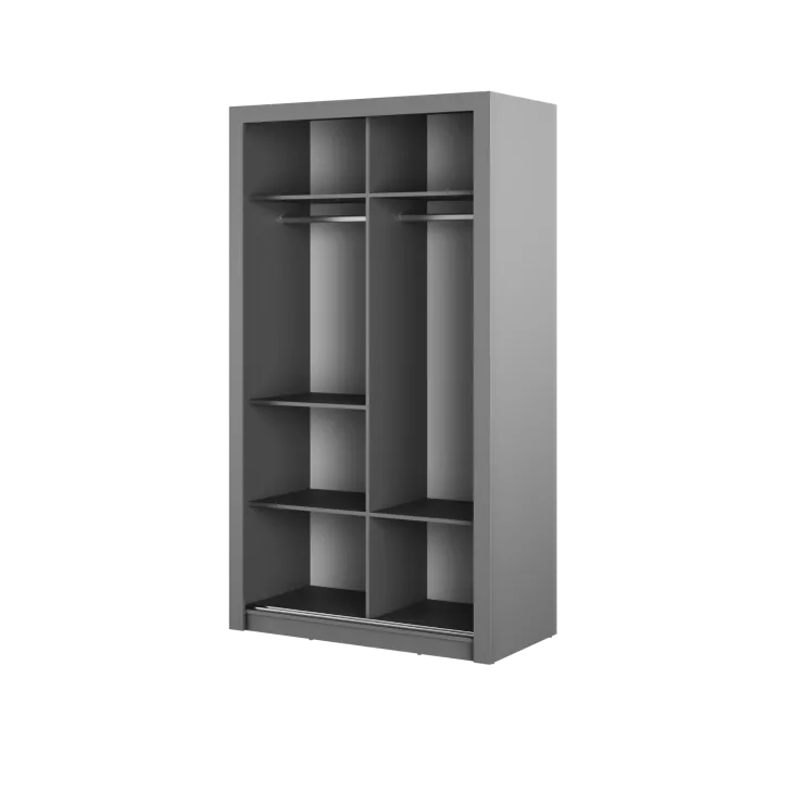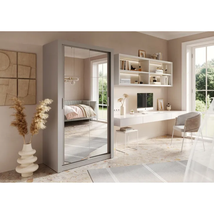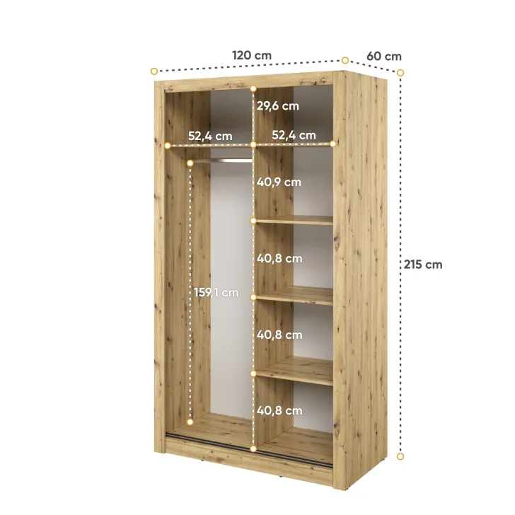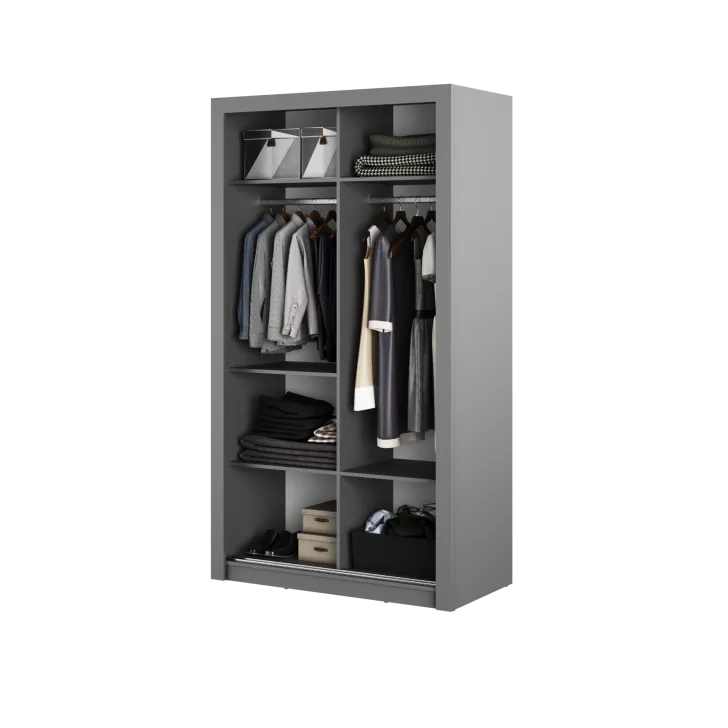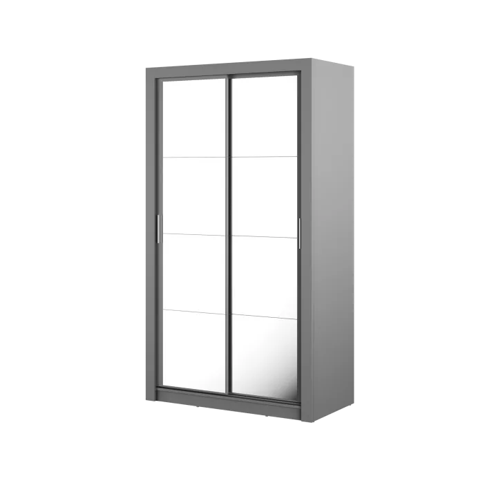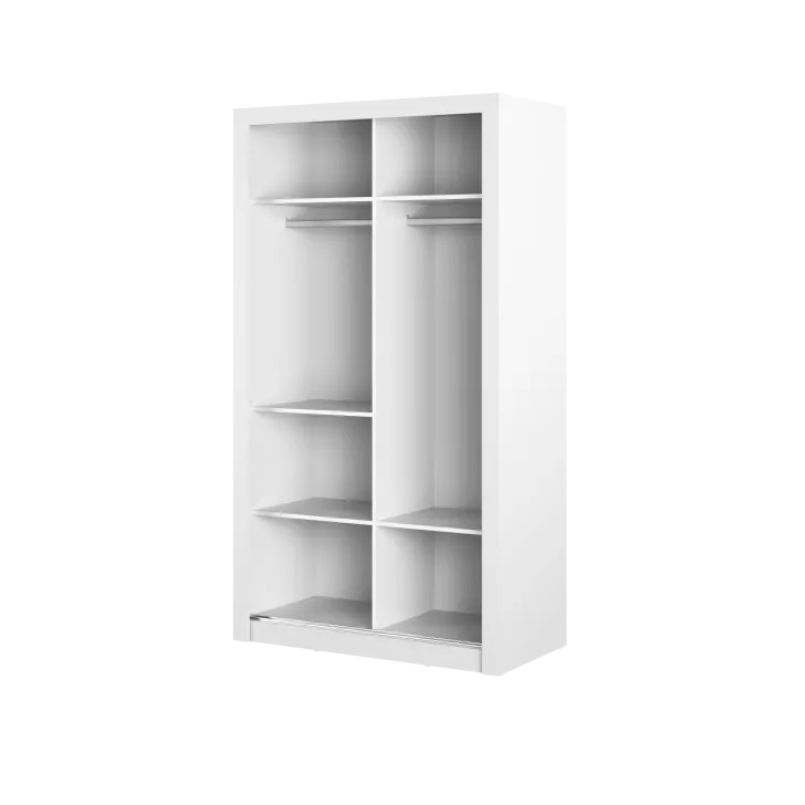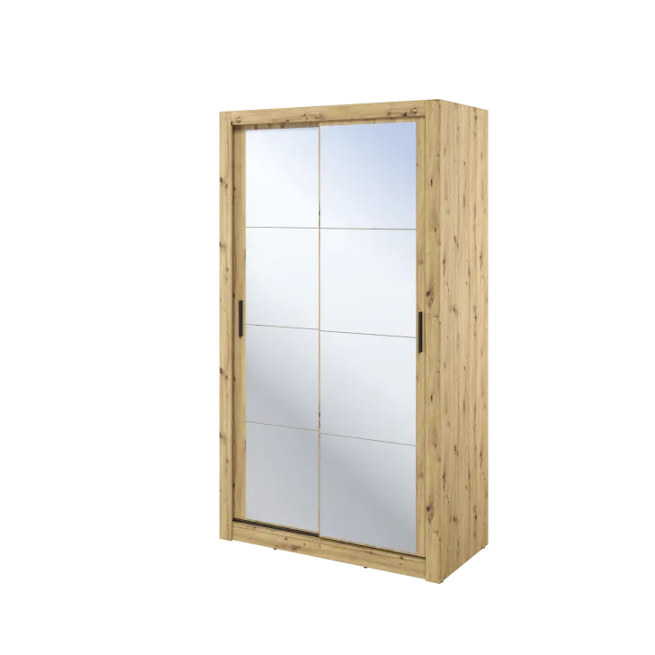 Wyposażona w dwie przesuwane drzwi z dołączonymi lustrami, szafa nie tylko dodaje przestrzeni naszemu pomieszczeniu, ale pozwala też na swobodne przejrzenie się w nich. Wewnątrz znajdziemy jeden drążek na ubrania i kilka pojemnych półek, co z pewnością ułatwi przechowywanie rzeczy. Śliskie drzwi przesuwne umożliwiają łatwy dostęp do przechowywanych w szafie ubrań. Szafa może zostać bezpiecznie przymocowana do ściany za pomocą otworów montażowych znajdujących się na tylnej i bocznych ściance szafy.