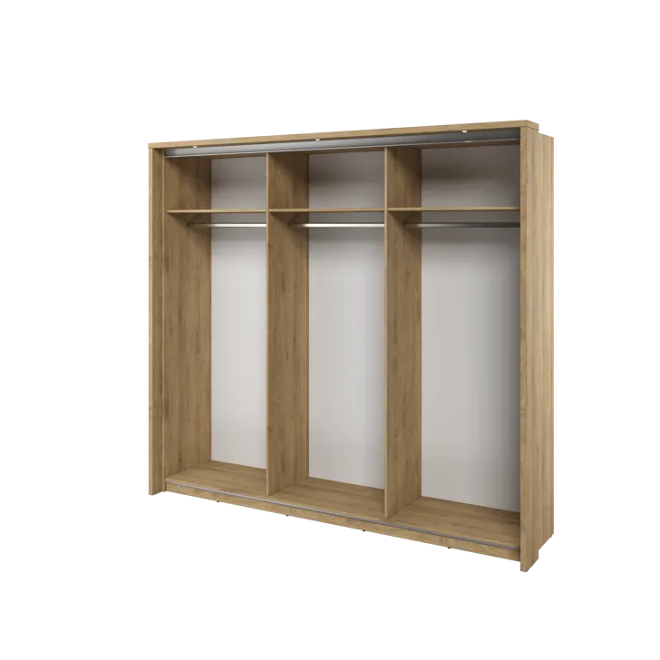 Charakteryzuje się minimalistycznym wyglądem i uniwersalnym wybarwieniem - Dąb Shetland, co sprawia, że doskonale dopełnia zarówno nowoczesne, jak i klasyczne wnętrza. Szafa ERTA 27 wyróżnia się trojgiem praktycznych drzwi przesuwnych, które zapewniają łatwy dostęp do wnętrza, realizując założenie o jak najlepszym wykorzystaniu dostępnej przestrzeni.