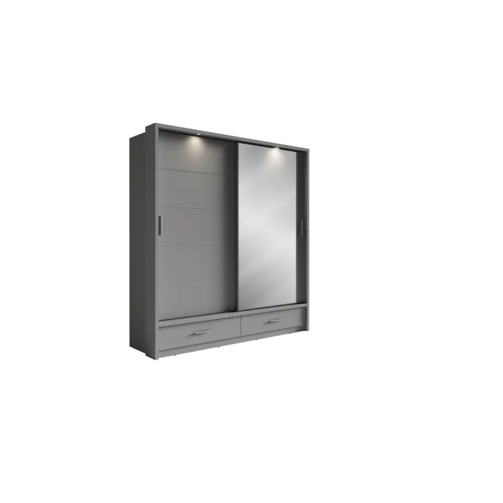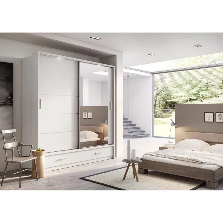 Wyróżniająca się unikalnym projektem, dbałością o szczegóły, a także wszechstronnością - czynniki te sprawiają, że szafa ERTA 5 to idealna propozycja na mebel do sypialni lub garderoby. Zapewnia szeroką gamę rozwiązań dla przechowywania, dzięki czemu będziesz mieć wszystko pod ręką, czy to ubrania, czy akcesoria. Dwa drzwi przesuwne zapewniają łatwy dostęp do zawartości szafy, a także optymalizują wykorzystanie przestrzeni. Dodatkowo, lustro na jednym z drzwi optycznie powiększa przestrzeń, umożliwia szybkie sprawdzenie stylizacji i oszczędza czas przed wyjściem z domu.