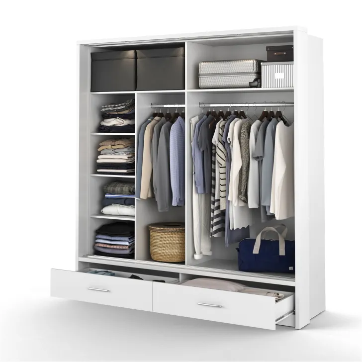 - Dzięki dwóm metalowym drążkom na ubrania oraz kilku pojemnym półkom, przechowanie ubrań i akcesoriów staje się szybkie i proste;