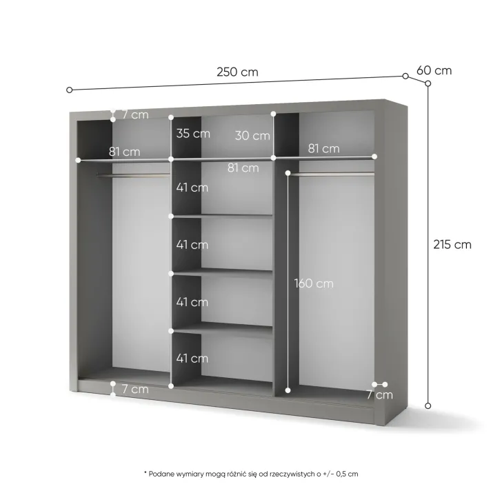 Szafa JADIA 1 to funkcjonalna odpowiedź na Twoje potrzeby organizacji przestrzeni. Niezastąpiony element każdego domu, stworzony z myślą o oszczędzaniu miejsca i systematycznym przechowywaniu ubrań oraz innych akcesoriów. Ta solidna, przestrzenna szafa z kolekcji JADIA, została zaprojektowana z troską o każdy, nawet najmniejszy detal. Wyposażona w trzy praktyczne drzwi przesuwne oraz wewnętrzne lustra, które dodatkowo optycznie powiększają przestrzeń. Co więcej, Szafa JADIA 1 posiada dwie praktyczne szyny na wieszaki i sześć obszernych półek, które pomieszczą wszystko, czego potrzebujesz, umożliwiając zachowanie perfekcyjnego porządku. Poniżej prezentujemy kilka ważnych cech, które wyróżniają ten model: