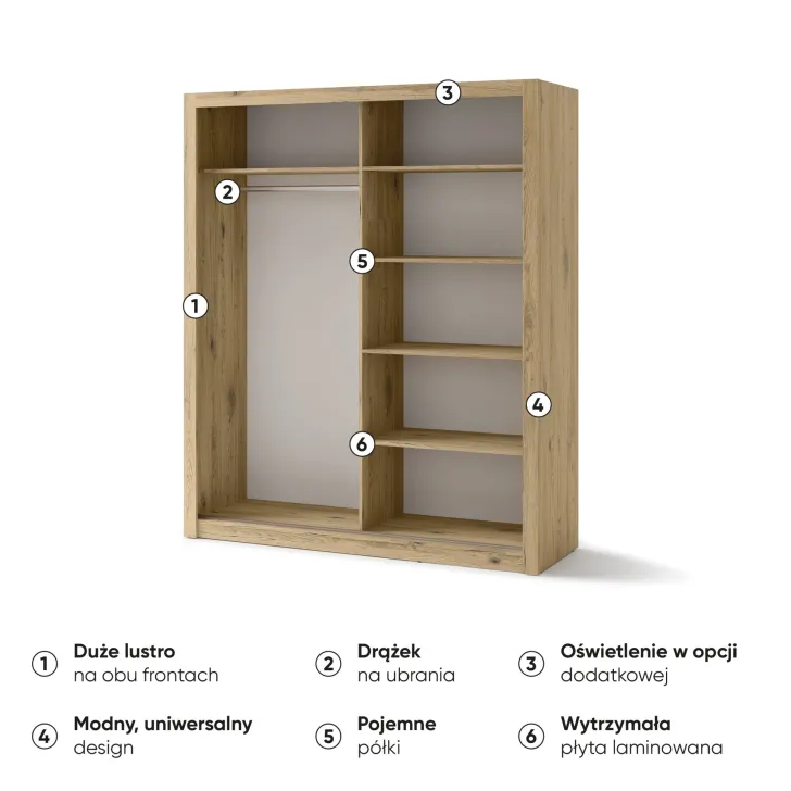 Szczególnie wyróżniającym się elementem w szafie JADIA 3 są jej dwuskrzydłowe drzwi przesuwne z lustrem. Dzięki takiemu rozwiązaniu, zarówno wnętrze szafy jak i całe pomieszczenie optycznie powiększa się, a Ty zyskujesz pełen komfort podczas korzystania z niej. Niewątpliwą zaletą jest także jej wyposażenie, które obejmuje drążek na wieszaki i obszerne półki, umożliwiając łatwe i przejrzyste uporządkowanie wszystkich przechowywanych rzeczy.
