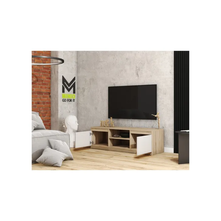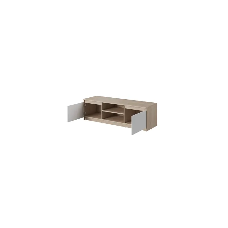 • Przemyślany układ przestrzeni: Szafka posiada dwoje zamykanych drzwi, za którymi możesz przechowywać różne drobiazgi. Dwie otwarte półki stanowią idealne miejsce dla sprzętu RTV, oferując łatwy dostęp do urządzeń.