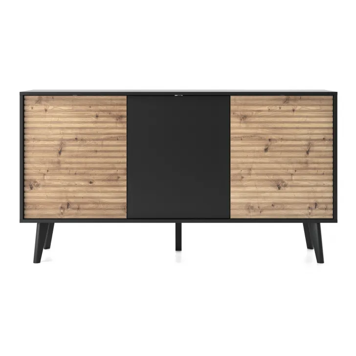 Estetyka komody również nie jest bez znaczenia. Czarny, matowy kolor szafki znakomicie współgra z ozdobnym frontem w kolorze Artisan Oak. Taki duet kolorystyczny nadaje całemu meblowi nowoczesnego, a zarazem eleganckiego wyglądu i pozwala wkomponować go w różne stylistyki wnętrz.