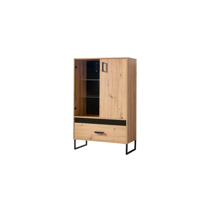 Witryna MELLE 6 ma czarne metalowe nogi i uchwyty oraz tylne płyty HDF w kolorze czarnym, które podkreślają jej prostotę, ale efektowny loftowy design, utrzymane w kolorystyce dąb artisan.