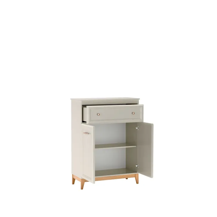 Kolekcja DUBAI to meble pełne wyważonej elegancji i harmonii. To styl, który pięknie komponuje się zarówno z klasycznymi, jak i nowoczesnymi aranżacjami. Ciepłe odcienie naturalnego drewna zestawione z odcieniem kaszmiru nadają lekkości i elegancji, podczas gdy dekoracyjne listwy MDF na frontach dodają klasycznego uroku i subtelnie zdobią bryłę mebla. Aby podkreślić wyjątkowy charakter komody DUBAI 4, zastosowano stylowe uchwyty w kolorze miedzi.